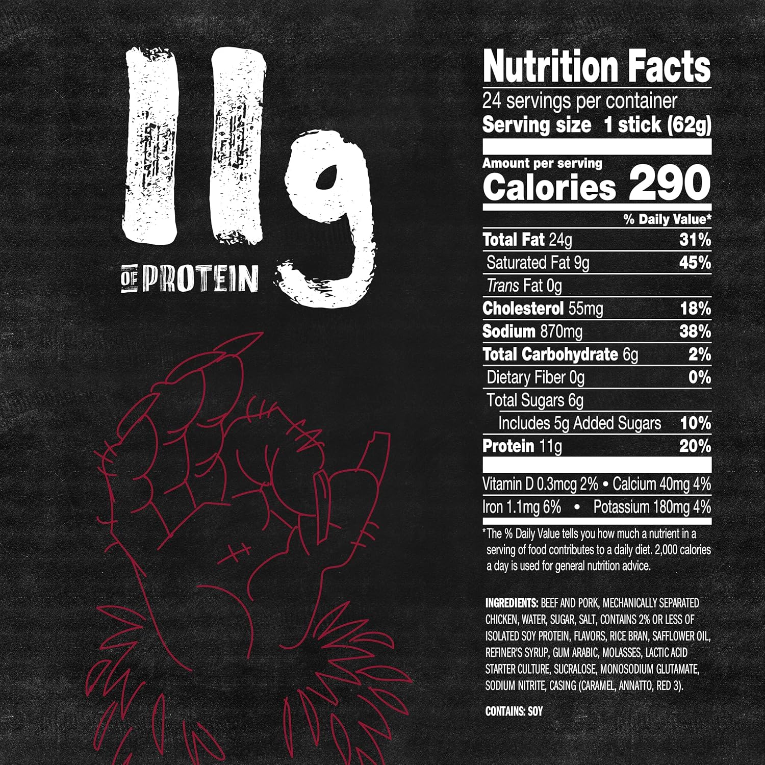 Jack Link's Wild Sticks are the bigger, better option when it comes to standing out. With the trusted taste of Jack Link’s but more wild, this snack packs big flavor into every bite. This pack contains 24 - 2.2-ounce Jack Link's Wild Inspired by the flavors of Dr.Pepper Sticks, full of bold, Dr. Pepper flavor filled notes. With 11 grams of protein and 290 calories per 62g serving, these sticks are the perfect portable snack for a busy lifestyle. The next time you reach for a snack, don't just feed your hunger, Feed Your Wild Side with Jack Link's Wild Inspired by the Flavors of Dr. Pepper Sticks.